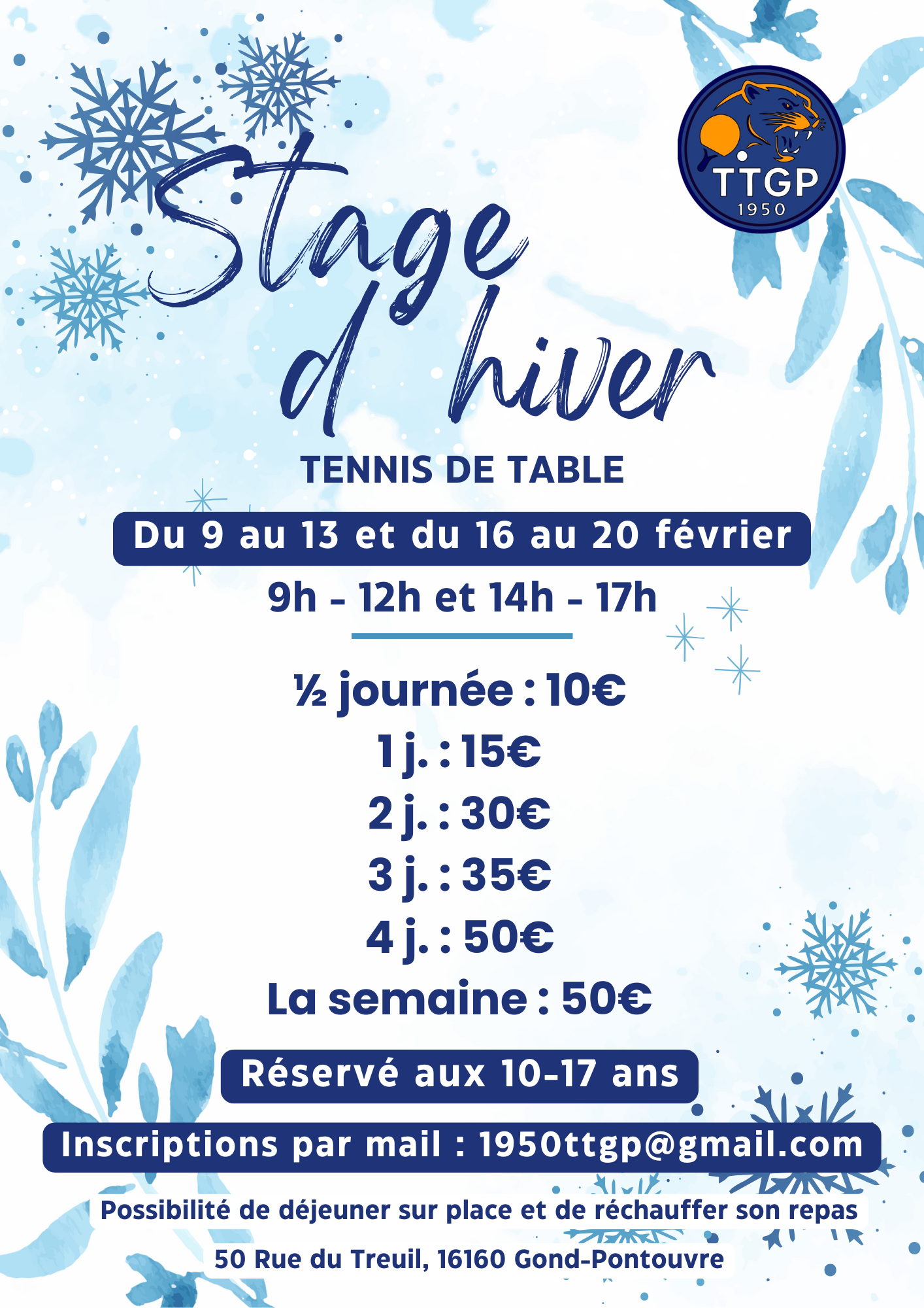 Vous avez entre 10 et 17 ans et vous souhaitez perfectionner votre technique ou simplement vous amuser pendant les vacances ? Le TTGP 1950 organise ses traditionnels stages d'hiver à la salle spécialisée de Gond-Pontouvre.